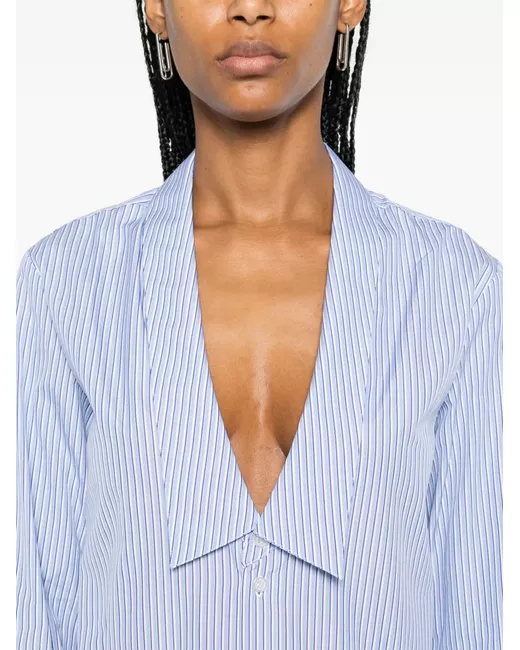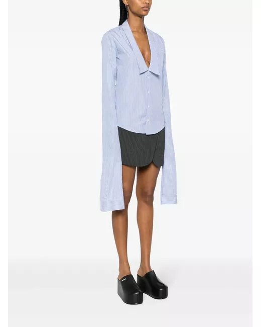 blue/white cotton poplin texture vertical stripe pattern classic collar plunging U-neck extra-long sleeves curved hem front button fastening