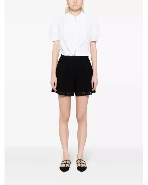 black cotton openwork areas pleat detailing lace trim concealed front button, hook and zip fastening