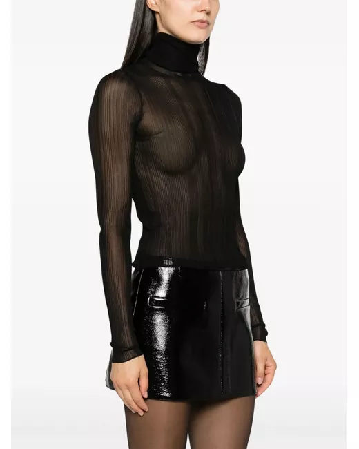black semi-sheer construction ribbed knit high neck long sleeves straight hem