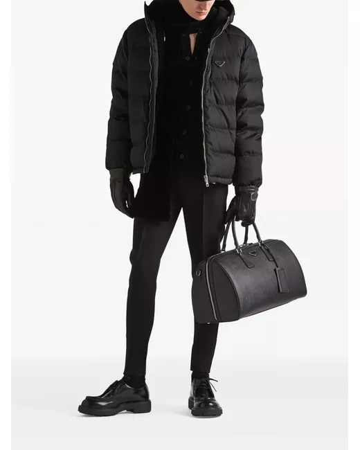 black down-feather filling padded design enamel triangle logo classic hood front zip fastening long sleeves elasticated cuffs two side welt pockets cropped straight hem