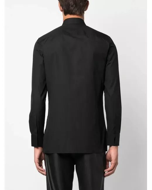 jet black cotton ripstop texture silver-tone logo plaque pointed flat collar concealed front fastening long sleeves buttoned cuffs straight hem