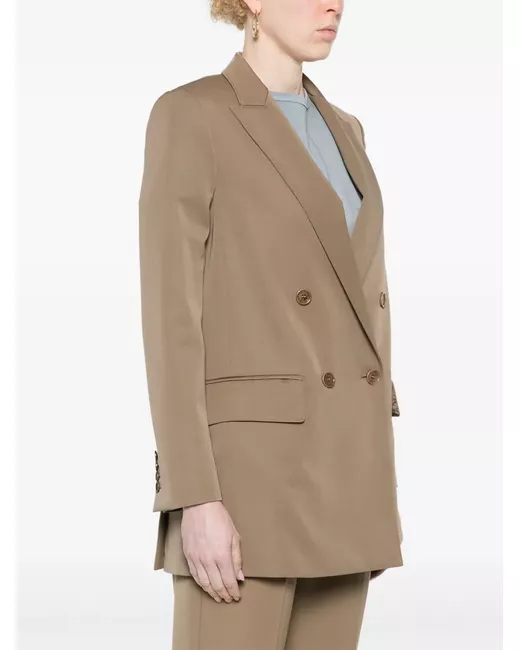 light brown virgin wool blend notched lapels shoulder pads long sleeves with faux buttoned cuffs chest welt pocket front flap pockets English rear vents partial lining double-breasted button fastening
