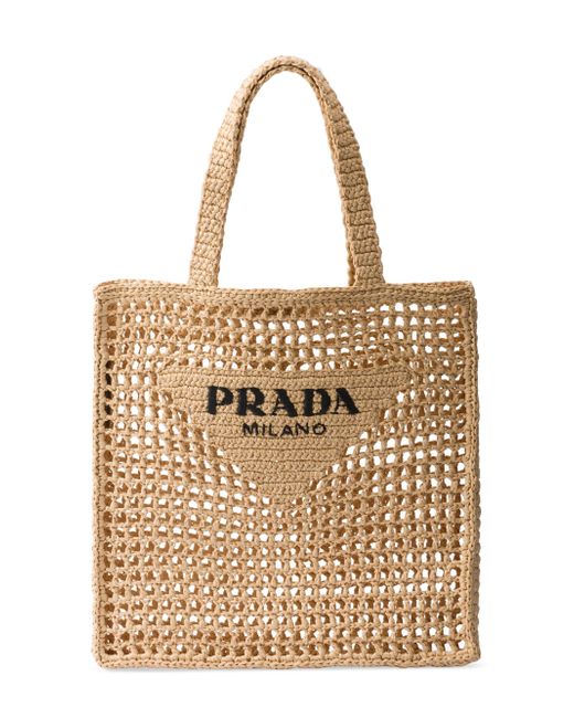 This tote bag with a soft, deconstructed design is made of raffia-effect yarn, a light material with a summery mood. A new interpretation of Prada's emblematic triangle decorates the front and is embellished at its center with the embroidered lettering logo. Raffia-effect yarn Crochet workmanship Embroidered lettering logo on the front Unlined Imported SIZE 36.0W x 38.0H x 3.0L. Lsd Handbags - Prada Handbags Access > Prada > Saks Fifth Avenue > Barneys. Prada. Color: Beige Khaki.
