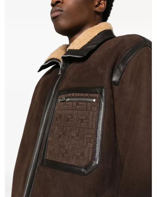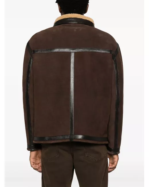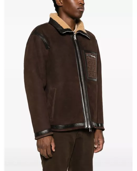 brown lambskin leather trim shearling lining high neck front zip fastening long sleeves embossed logo to the front zip-fastening chest pocket two side inset pockets straight hem