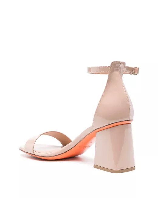 blush pink calf leather patent finish square open toe branded leather insole leather sole 75mm high block heel buckle-fastening ankle strap