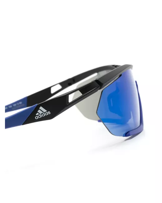 blue/black acetate shield frame mirrored lenses nose pads sculpted arms and curved tips These glasses come with a protective case.