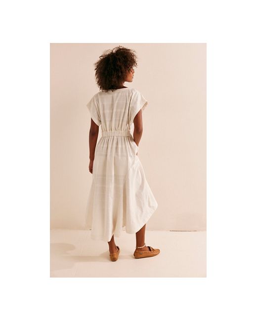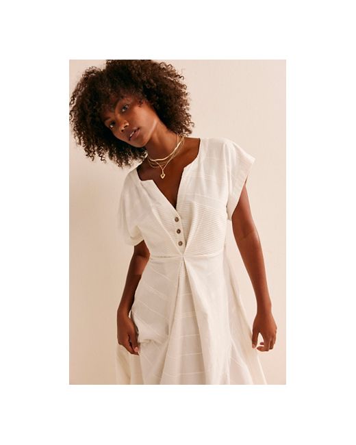 The perfect contemporary midi with retro-inspired charm, this sweet style from our free-est collection will turn heads with every wear. **Fit:** Slim at the bodice with true A-line skirt design **Features:** Notched V-neckline, button-up closures, textured jacquard fabrication, front pleated panel **Why We ❤ It:** Timeless with sleek flats or off duty with sporty sneakers, this style has endless ways to wear. Outta Here Midi by free-est at Free People in Ivory, Size: XS