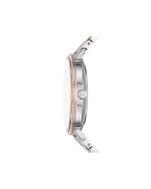 An instant classic, our Pyper is the perfect new addition to your wardrobe. This two-tone alloy watch features a white stamped logo dial with glitz indexes and a pave topring for just the right touch of sparkle. Style #MK4667.