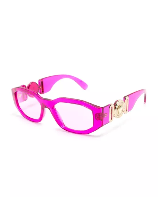 fuchsia pink acetate transparent design rectangle frame pink tinted lenses UV-protective lenses Medusa Head motif at the arm sculpted arms with curved tips These glasses come with a protective case.