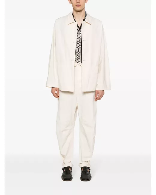 ecru cotton spread collar long wide sleeves two inset pockets at the chest two front patch pockets unlined straight hem front button fastening
