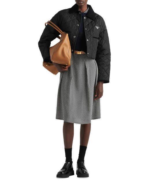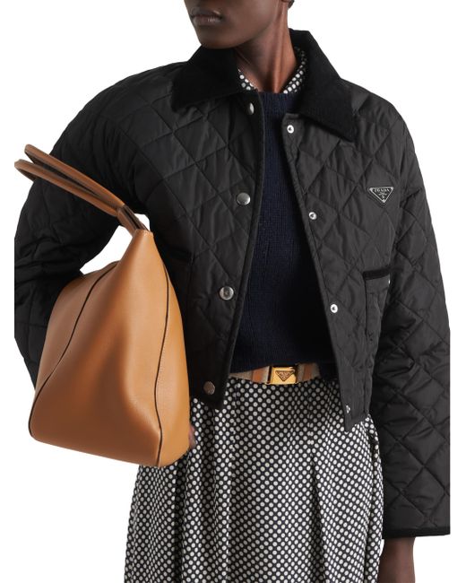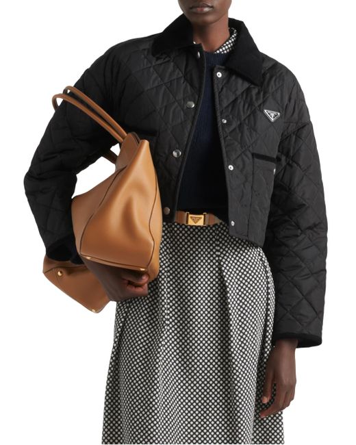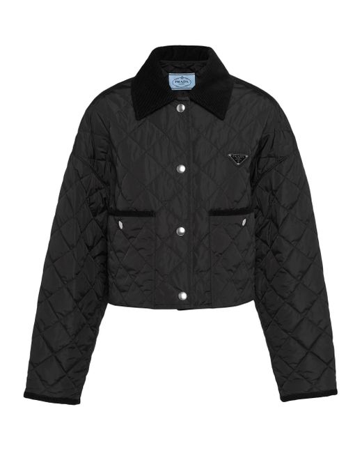 The timeless design of this quilted jacket is reinterpreted with a contemporary cropped silhouette. The pragmatic style is made of Re-Nylon, the innovative regenerated nylon fabric that is distinctive of Prada collections, obtained from recycled plastic materials collected in the ocean. Enhanced by corduroy collar and trim, the garment is embellished with the iconic signature touch of the enameled metal triangle logo. For sustainable care to preserve the product's characteristics and reduce microfiber shedding, we recommend not washing the item too often. Let the product air out after every use and have it dry cleaned at a specialized ecological dry cleaners. Unlined Shirt-style collar Long sleeves Pockets with snaps Enameled metal triangle logo Quilted external fabric Corduroy collar and pocket trim Regular fit, the garment fits the indicated size Made in Italy. Lsd Rtw - Prada Rtw > Prada > Saks Fifth Avenue > Barneys. Prada. Color: Black. Size: 6.