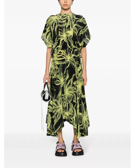 black/yellow silk abstract pattern print draped design round neck concealed rear zip fastening short draped sleeves fitted waistline flared skirt long length asymmetric hem