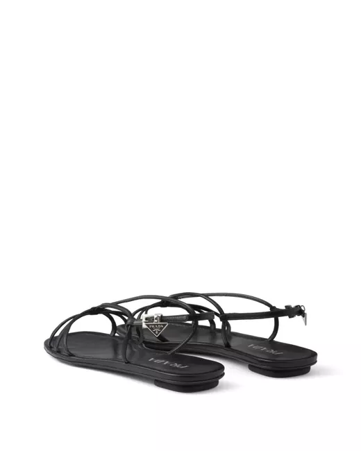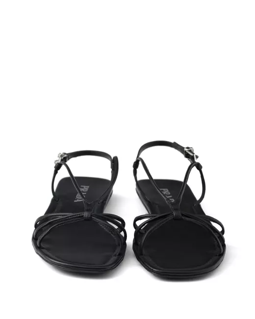 black leather enamel triangle logo square open toe buckle-fastening ankle strap branded insole flat leather sole