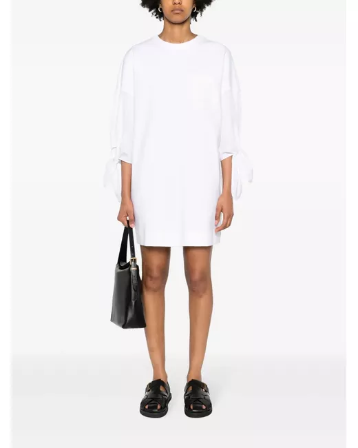 off-white jersey texture crew neck drop shoulder contrasting panel detail tied cuffs logo print at the chest mid-length straight hem rear zip fastening