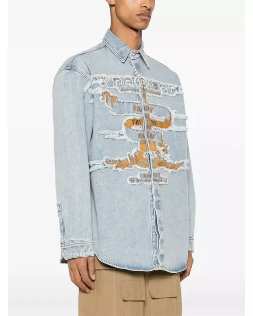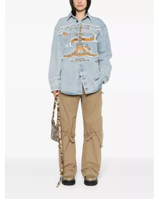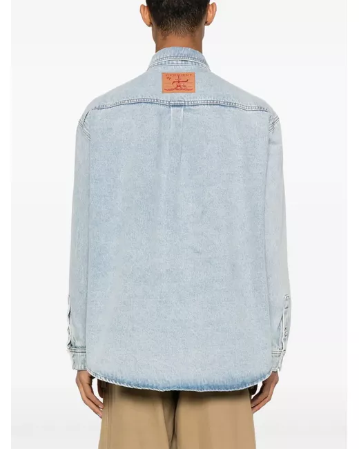 ice blue organic cotton denim distressed effect ripped detailing classic collar long sleeves buttoned cuffs embroidered detailing to the front logo patch to the rear pleat detailing straight hem concealed front button fastening When buying this unisex item, keep in mind that it is graded in standard men's sizing.