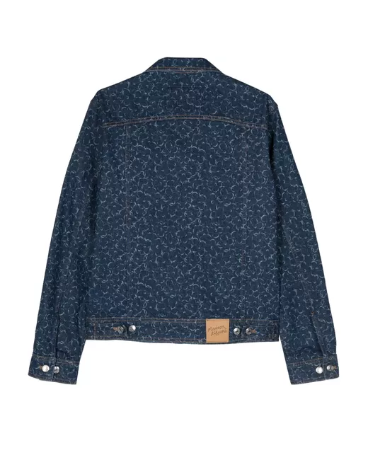 blue cotton denim dark wash all-over geometric pattern contrast stitching spread collar long sleeves chest patch pocket mini logo tag two side inset pockets logo patch to the rear straight hem front button fastening