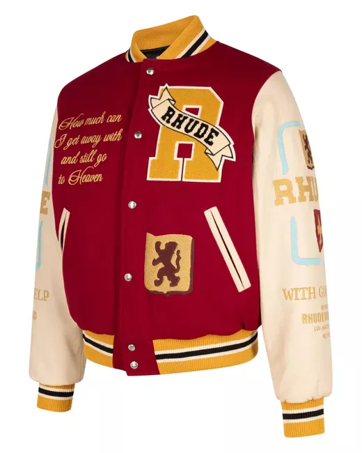 beige/red wool blend appliqué detail embroidered motif ribbed detailing two-tone design stand-up collar front button fastening two diagonal pockets to the sides long sleeves straight hem