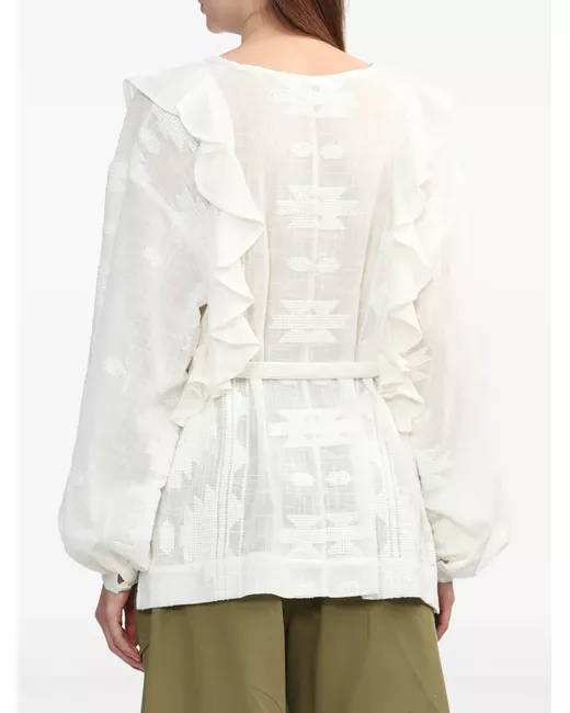 white cotton ruffled detailing belted waist all-over embroidered detailing front button placket long sleeves buttoned cuffs straight hem