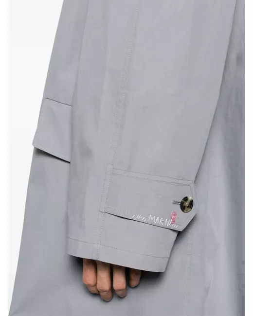 cool grey cotton embroidered logo at the cuff classic collar concealed front button fastening long raglan sleeves buttoned cuffs two side flap pockets rear slit unlined straight hem maxi