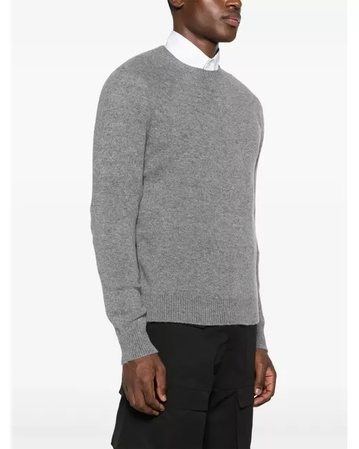 medium grey virgin wool-cashmere blend knitted construction crew neck long raglan sleeves ribbed cuffs and hem straight hem
