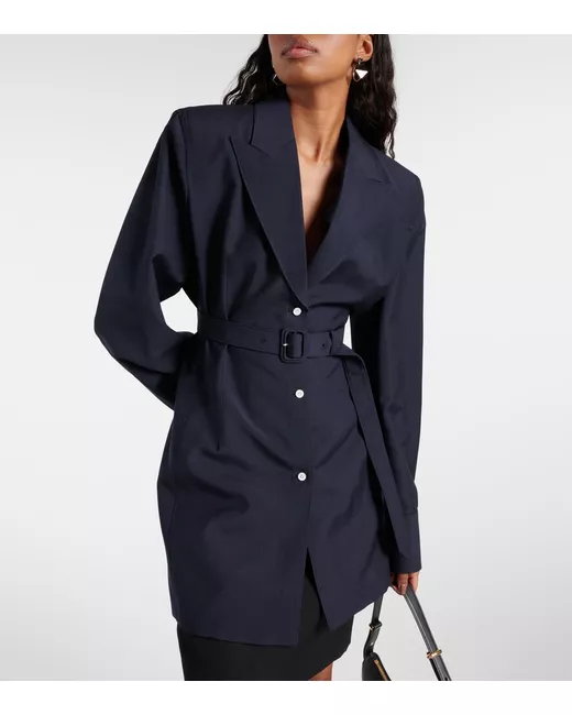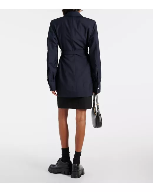 Material: 75% wool, 25% mohair. Care instructions: do not wash. Made in Italy. Designer color name: Bleu. Attached belt. Closure: single-breasted. Cuff: buttoned. Contains non-textile parts of animal origin.