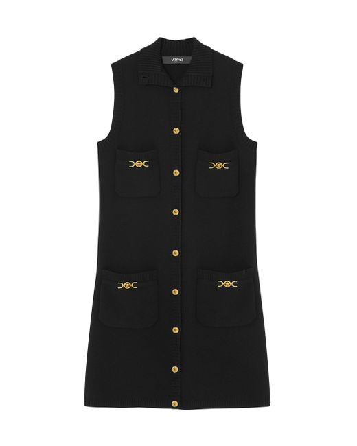 Knit from a luxurious virgin wool-cashmere blend, this elegant Versace minidress features a button-front silhouette. The piece features patch pockets and is intricately adorned with signature goldtone Medusa head detailing. Spread collar Sleeveless Chest and side patch pockets Button-front closure 70% wool/30% cashmere Dry clean Made in Italy SIZE & FIT Model measurements: 5'10" tall Model is wearing a US size 4 ABOUT THE BRAND Founded in 1978, Versace is instantly recognizable by the signature Medusa head logo, chosen by founder Gianni Versace for its Greek symbolism. The Italian label is known for its luxe, bold clothing and accessories-think gilding, oversized logos and punchy prints. Since taking over artistic direction, Gianni's sister Donatella Versace has maintained the brand's strong identity, with a renewed vision to give customers the ultimate freedom to express themselves. Advanced European - Versace > Versace > Saks Fifth Avenue > Barneys. Versace. Color: Black. Size: 2.