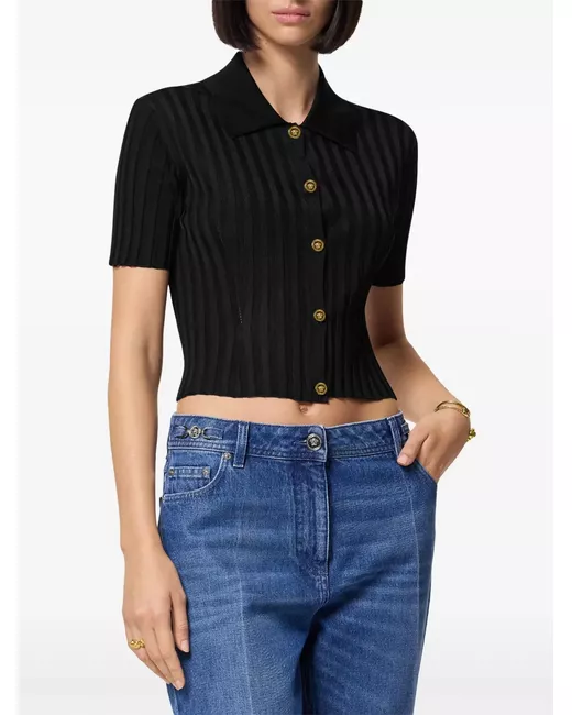 black ribbed knit classic collar short sleeves straight hem front button fastening