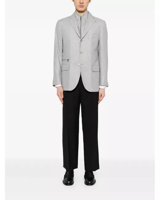 heather grey virgin wool-silk blend mélange effect layered design notched collar front button and zip fastening long sleeves elbow patches buttoned cuffs chest welt pocket side zip-fastening pocket two side flap pockets straight hem