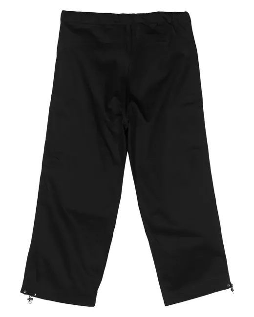 black cotton twill weave elasticated drawstring waistband drop crotch straight leg two front flap pockets two side zip-fastening pockets drawstring hem