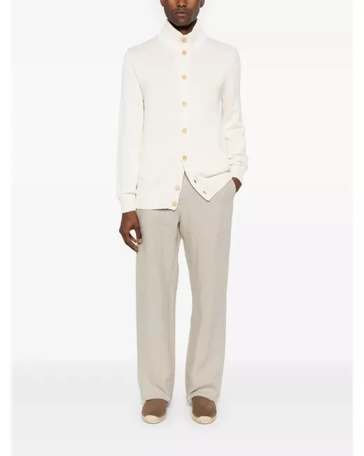 light beige cotton ribbed knit high neck front button fastening long sleeves ribbed cuffs and hem two side welt pockets straight hem