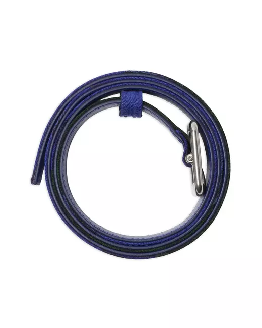 black/blue calf leather canvas check pattern signature B buckle silver-tone hardware punched holes belt loops adjustable fit