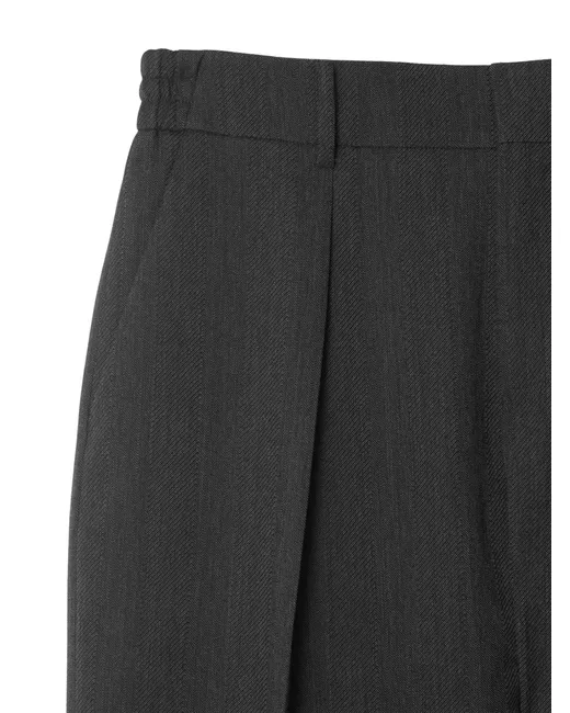 charcoal grey wool belt loops concealed front buffalo horn button, hook and zip fastening two side slit pockets rear welt pocket wide leg