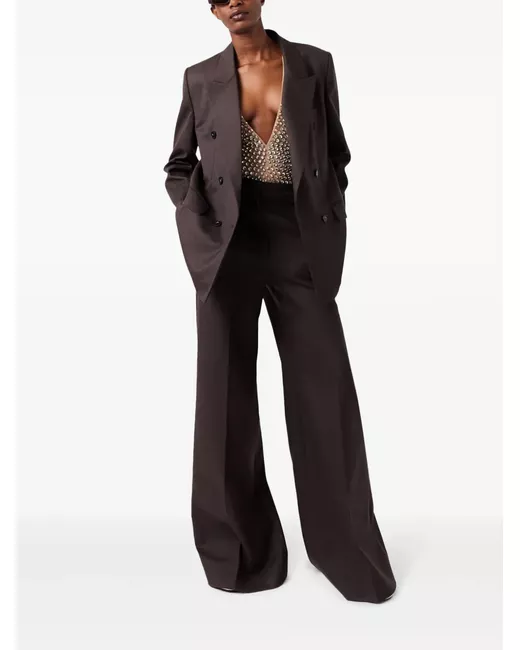 chocolate brown wool twill weave notched lapels double-breasted button fastening chest welt pocket two front flap pockets long sleeves buttoned cuffs straight hem