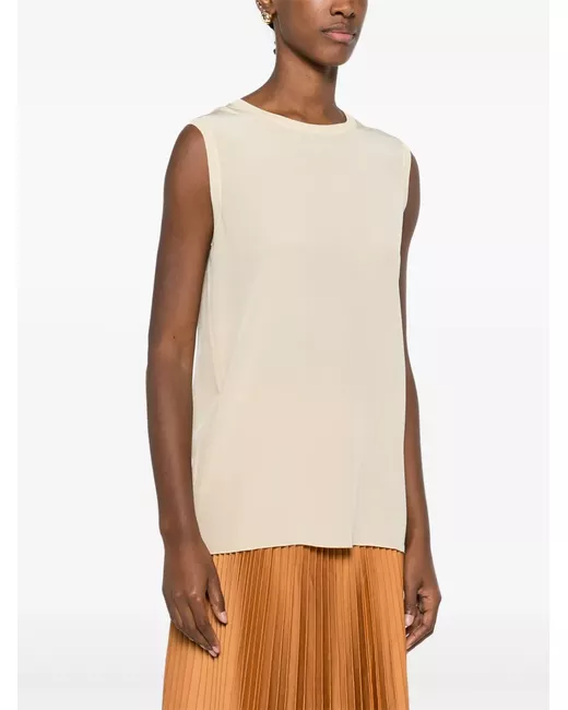 light beige silk crepe texture ribbed trim crew neck sleeveless curved hem