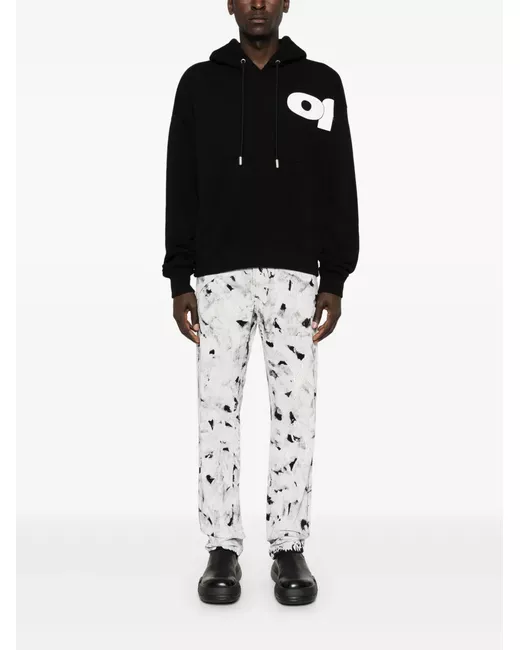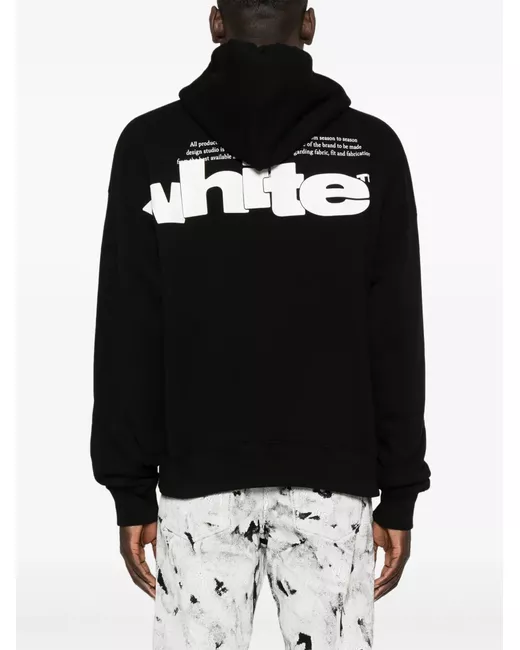 black/white cotton jersey texture logo print at the chest and rear text print to the rear drawstring hood drop shoulder long sleeves ribbed cuffs and hem front pouch pocket short side slits straight hem French terry lining