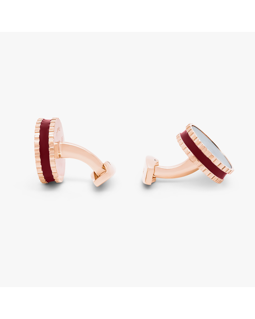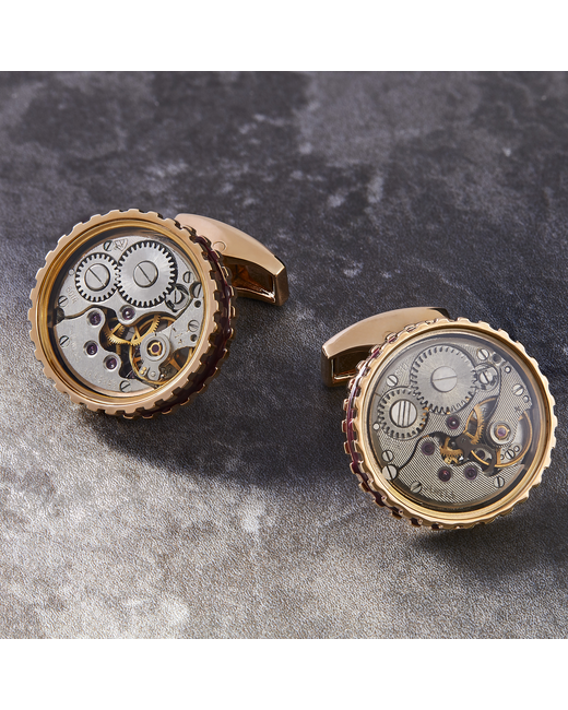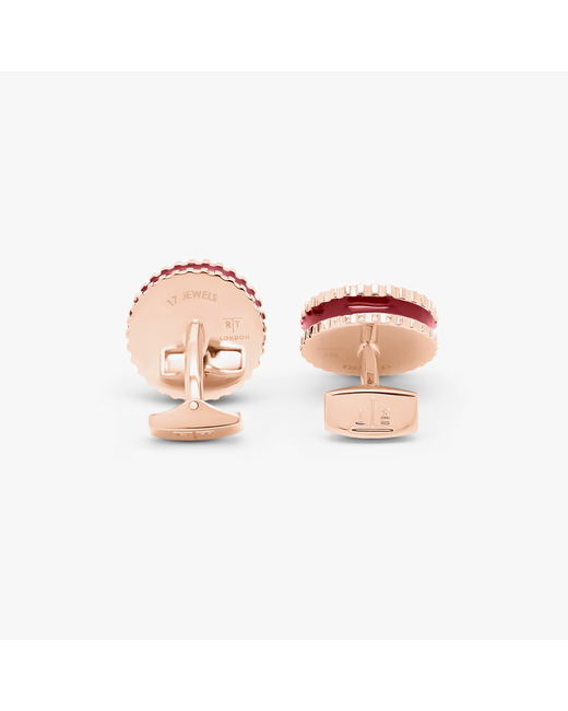 Our best-selling, vintage skeleton cufflinks capture the inner mechanism of a once-working automatic watch, framed within a smooth glass case. 17 jewels are placed inside each movement to replicate a watch's high performance, as the jewels allowed a free-flowing movement. The edged round shape is finished in rose gold coloured base metal and burgundy enamel.