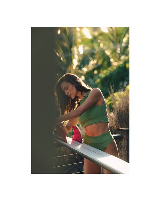 So sporty and ready for any adventure, this cropped bikini top is featured in a full coverage style and pull-on design with cool cross back straps, a high neckline, and textured fabrication. * Fixed straps * Crinkle fabric * High neckline Rhythm Wave Break Cross Back Surf Top at Free People in Pistachio, Size: XS