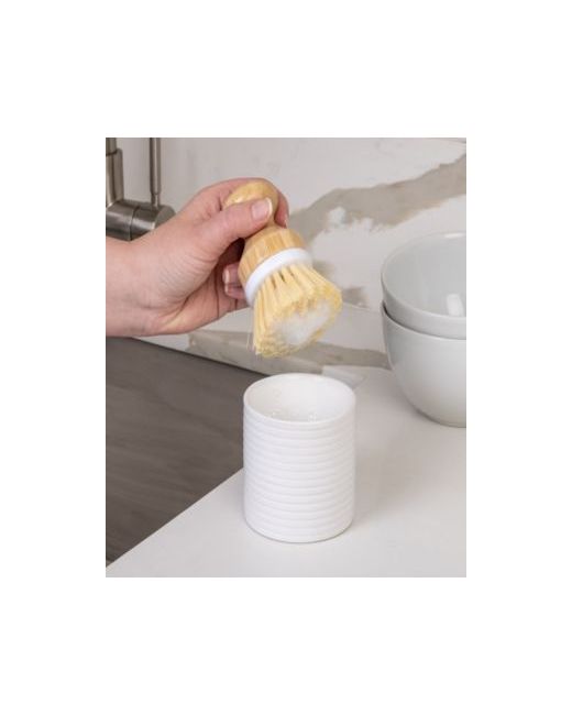 This Smart Design ceramic soap pump and brush set will keep your bathroom and kitchen sink areas neat and tidy with this stylish 4-piece set which includes a ceramic tray, glass soap bottle, small ceramic bowl, and a wooden bristle brush. Made of ceramic and glass.
