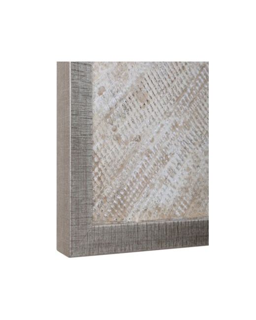 Hand painted on canvas, this artwork features heavy texture with natural beige and white tones and metallic silver highlights. A textured antique silver gallery frame accents the piece. Due to the handcrafted nature of this artwork, each piece may have subtle differences.