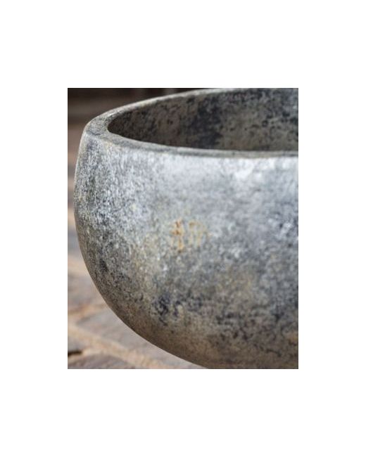 Terracotta bowl finished in an aged black with gold highlights and accented by a water hyacinth covered base.