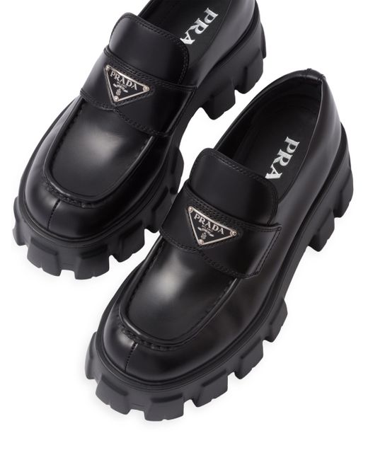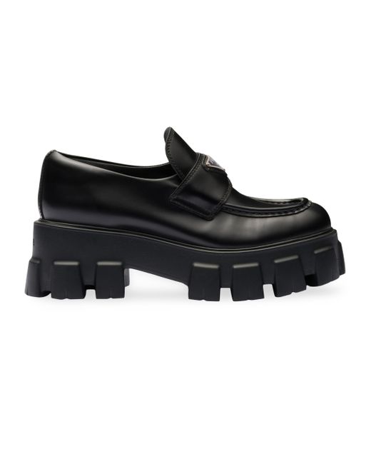 The Monolith loafers made of Prada's iconic and elegant brushed leather reinterpret the classic penny loafer in an original and contemporary way. This shoe, which takes its name from the chunky rubber sole, is an expression of timeless design that is monolithic and unique for its research, innovation, and style. Upper with leather band and metal triangle logo Apron with stitched raised edge Leather lining 55 mm / 2.1'' expanded rubber lug sole Removable leather-covered insole Imported. Lsd Rtw - Prada Rtw > Prada > Saks Fifth Avenue > Barneys. Prada. Color: Black. Size: 6.