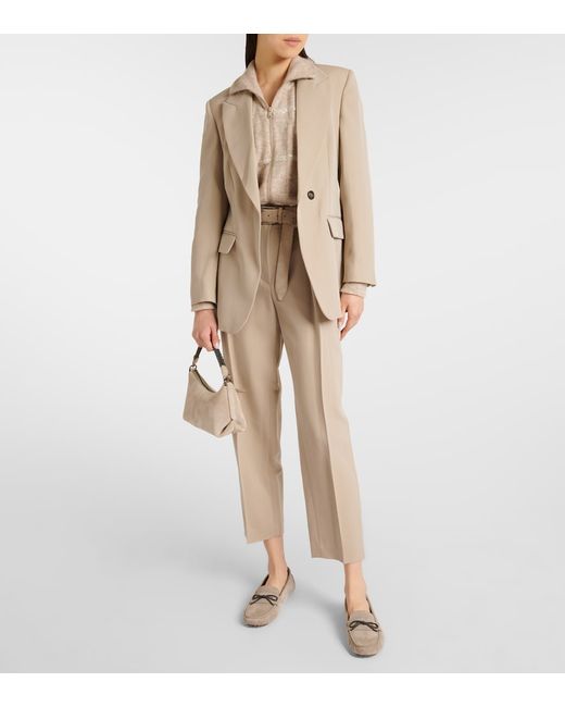 Material: 56% wool, 44% viscose. Care instructions: dry clean. Made in Italy. Designer color name: Beige. Lining: 36% polyester, 32% acetate, 32% cupro. Closure: zip, hook, and button fastening. Pockets: side slit pockets, back pockets.