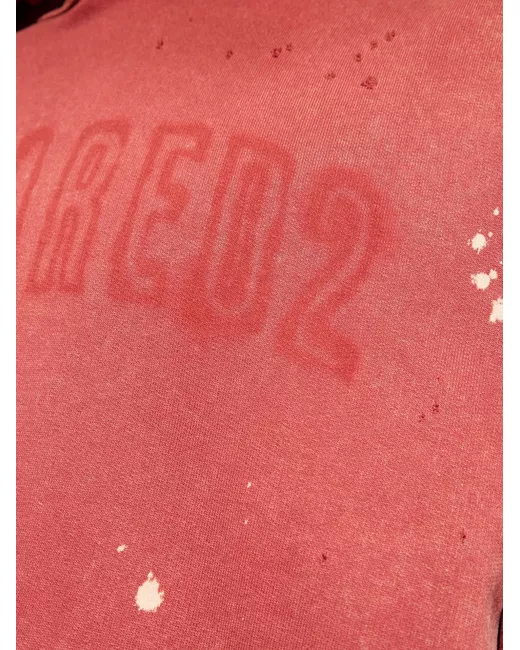 red cotton paint splatter detail logo print to the front slouchy drawstring hood long sleeves ribbed cuffs and hem straight hem