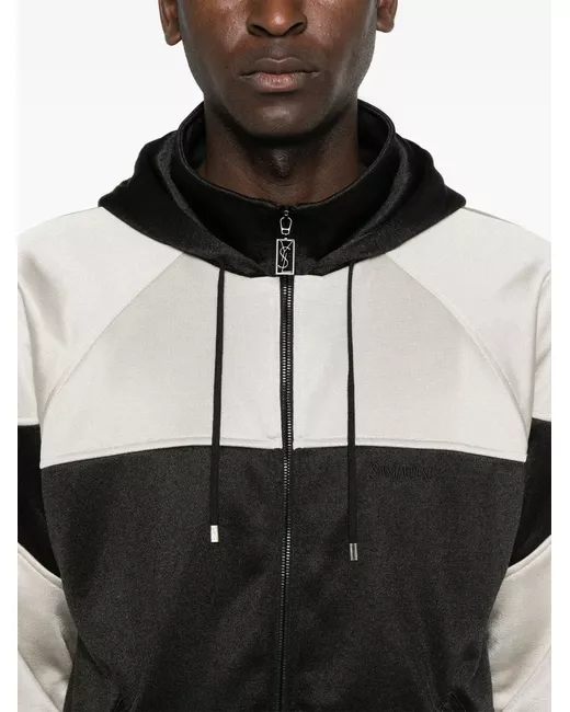 black/white two-tone design panelled design piped-trim detailing drawstring hood long sleeves ribbed cuffs and hem front zip fastening pockets straight hem front zip fastening