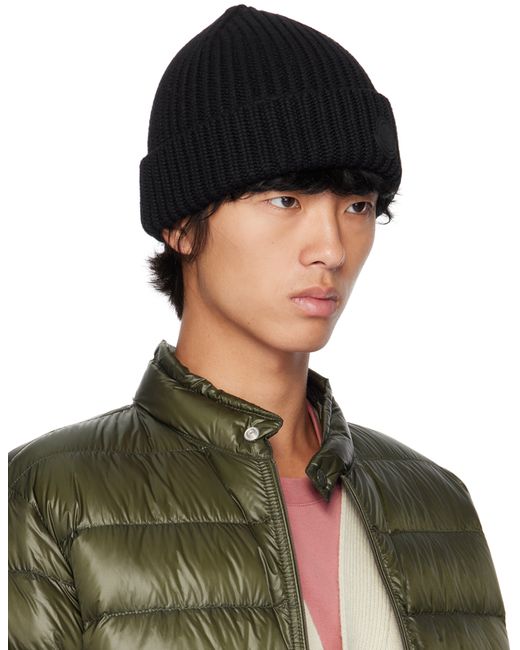 5-gauge rib knit ultra-fine virgin wool beanie in black. Rubberized logo patch at rolled brim. Supplier color: Black