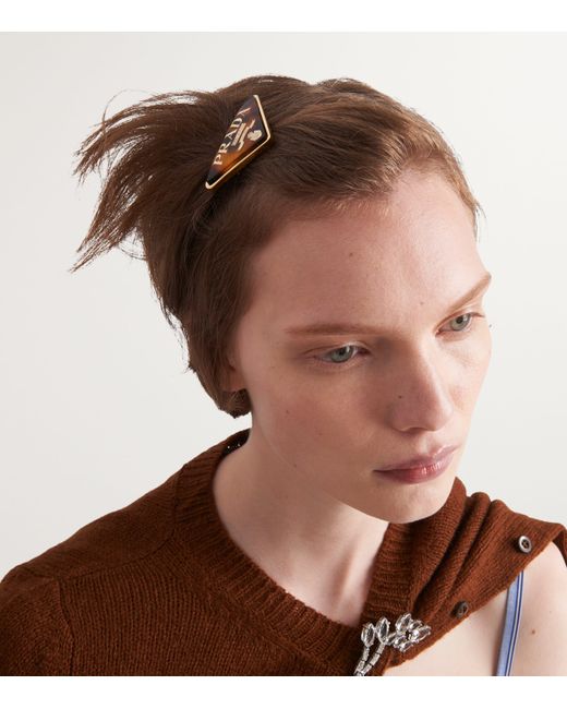 There are few logos as iconic as the Prada triangle, with the 1919 icon re-designed by the esteemed graphic designer Massimo Vignelli in 1977 when Miuccia Prada extended the House's offerings into clothing and shoes. This hair clip is a token of that journey, exhibiting over a hundred years of design history in one simple hair accessory.