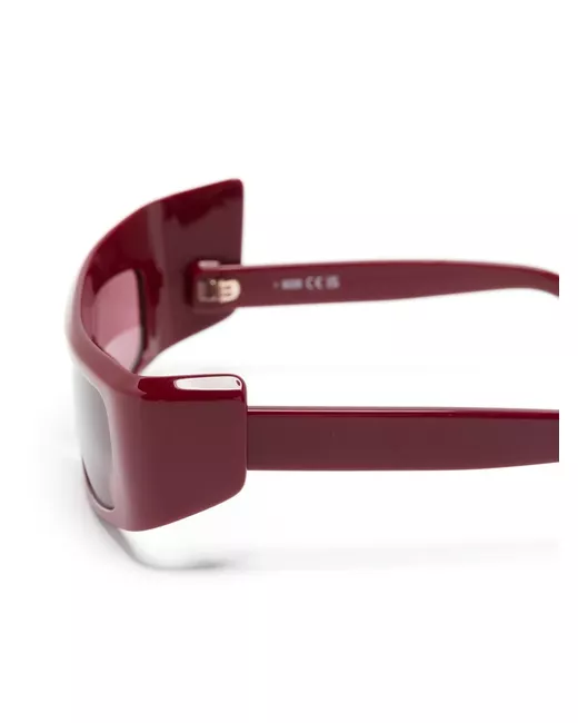 burgundy acetate wraparound frame asymmetric frame red tinted lenses gold-tone logo lettering straight arms curved tips These glasses come with a protective case.