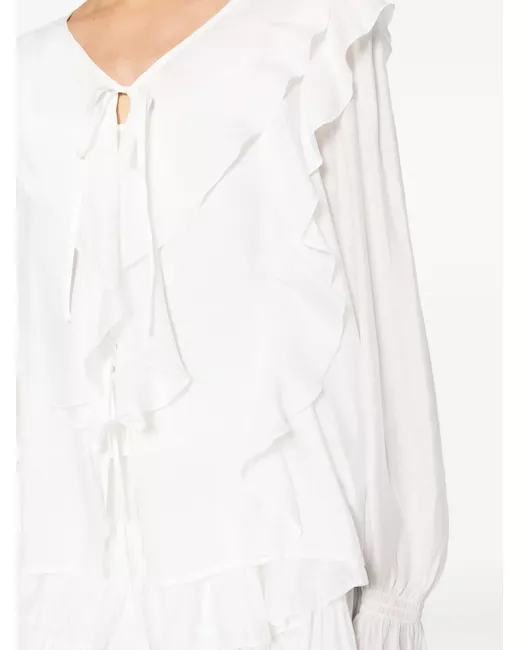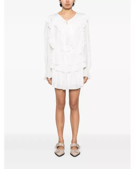 white muslin fully ruffled Top V-neck front tie fastening long sleeves elasticated cuffs Bottoms high-rise elasticated waistband thigh-length curved hem