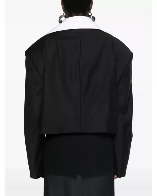 black/white wool/cotton layered design tailored design oversized spread collar front button fastening double-breasted button fastening shoulder pads long sleeves buttoned cuffs chest welt pocket two side flap pockets full lining straight hem cropped