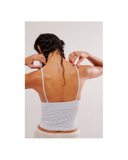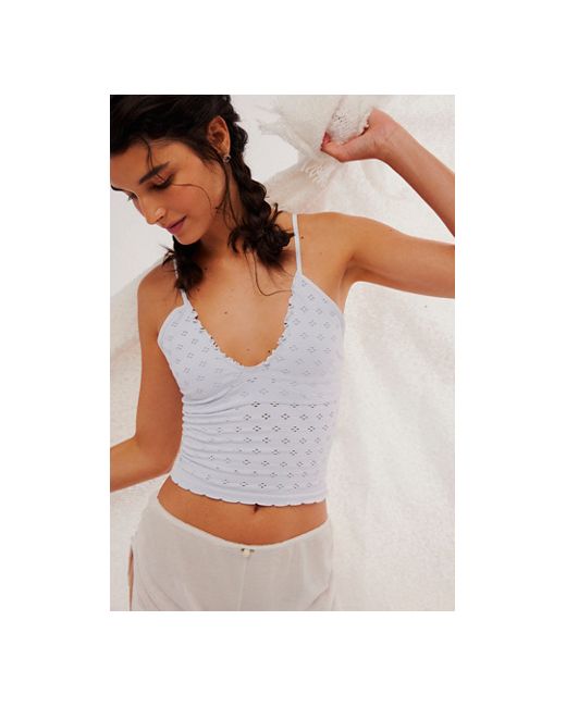 Our signature seamless fabrication in an ultra-flattering, triangle-cup design, adorned with eyelet details and lettuce trim for a sweet style you'll always reach for. **Fit:** Form-fitting, cropped **Features:** Triangle cups, lettuce-edge trim, seamless eyelet fabrication, fixed skinny straps, built-in shelf bra **Why We Eyelet Seamless Triangle Cami by Intimately at Free People in Country Air, Size: XS/S